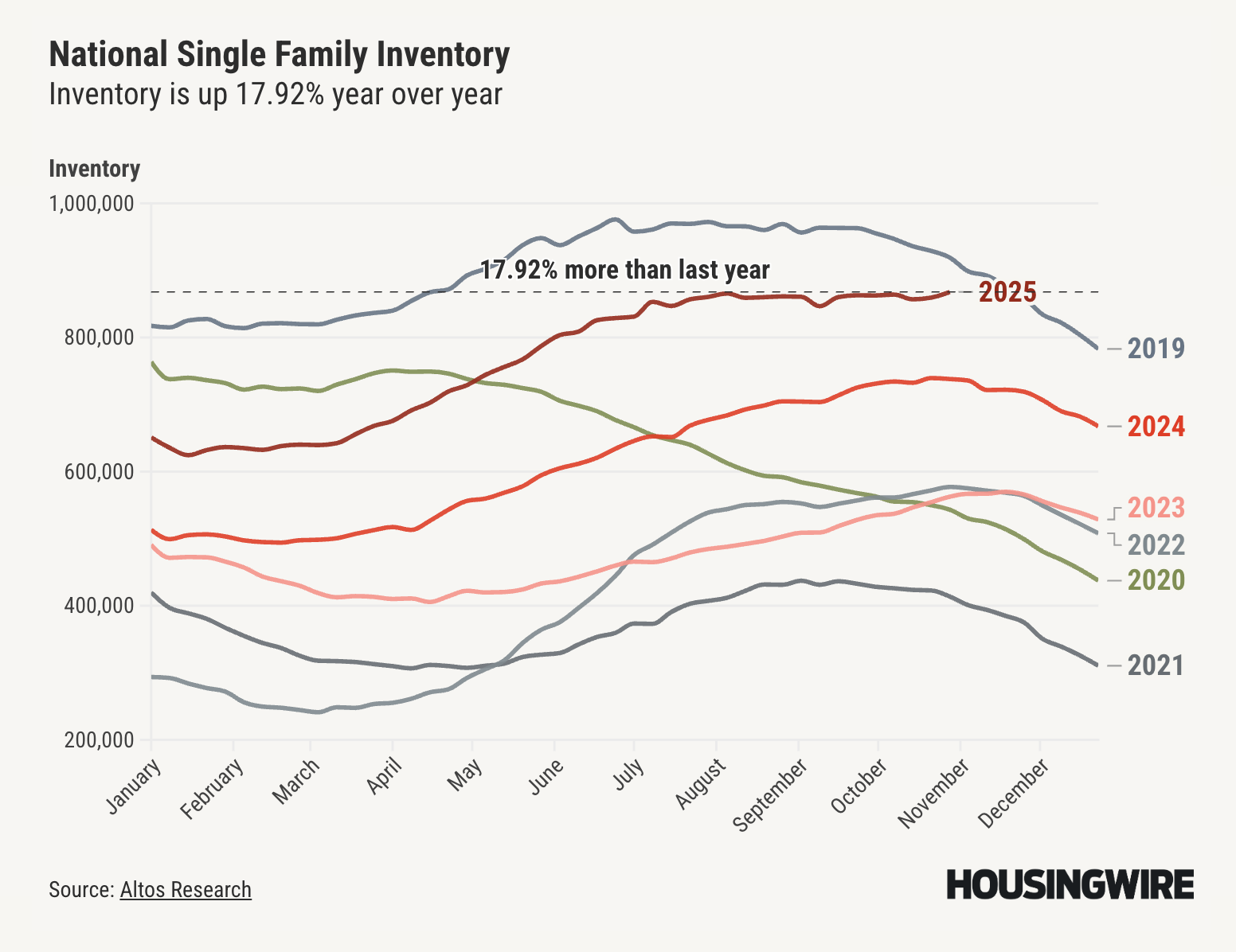Every year, we see a slowdown after the spring peak. This year, buyer activity peaked in May 2025, earlier than usual. Since then, inventory has stabilized, and we’re finally inching back toward 2019 levels, the last “normal” market before the pandemic.